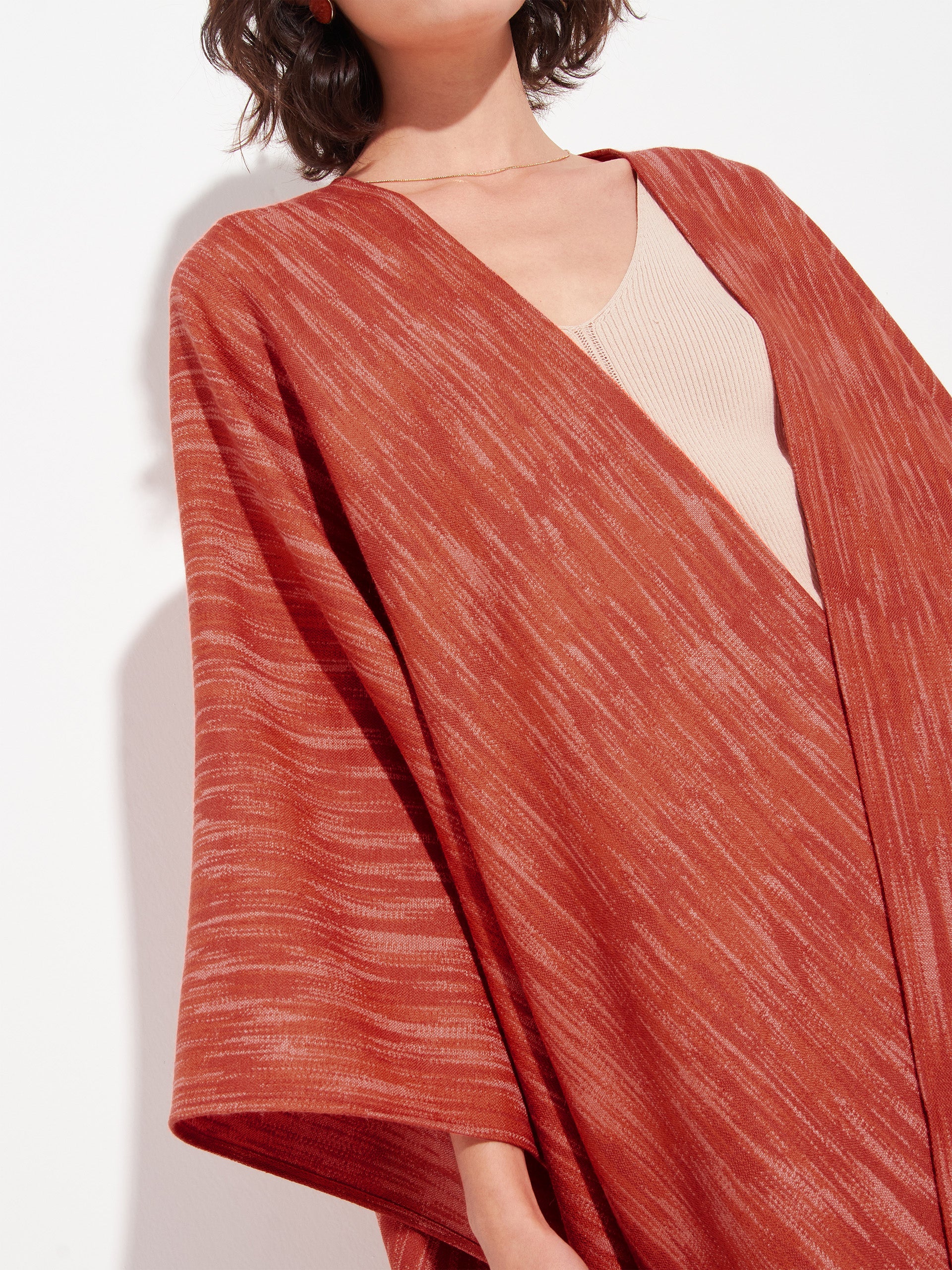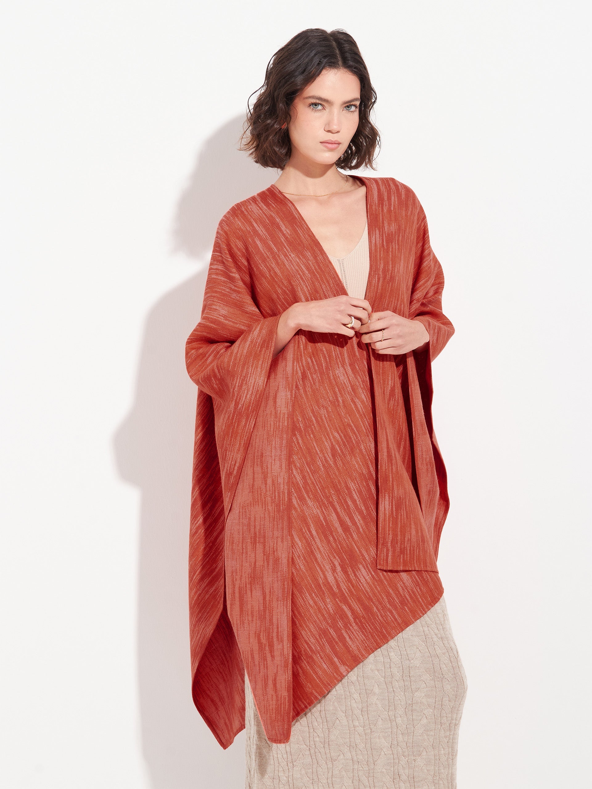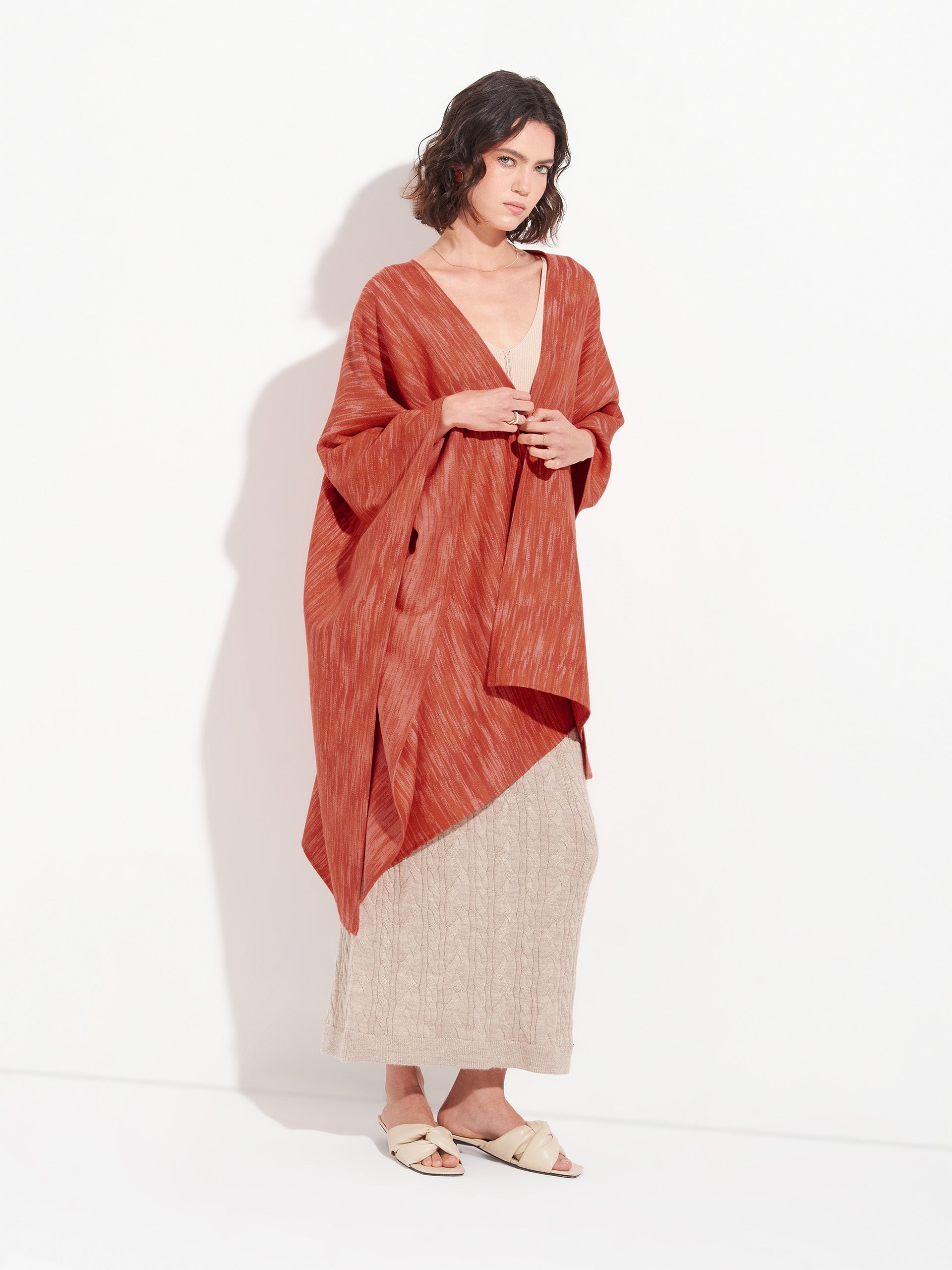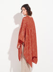 Zareli cape in orange, made from baby alpaca and silk. It is a double-sided cape with a three-color jacquard design, combining warmth, texture, and timeless elegance. | Predominant material: Baby Alpaca