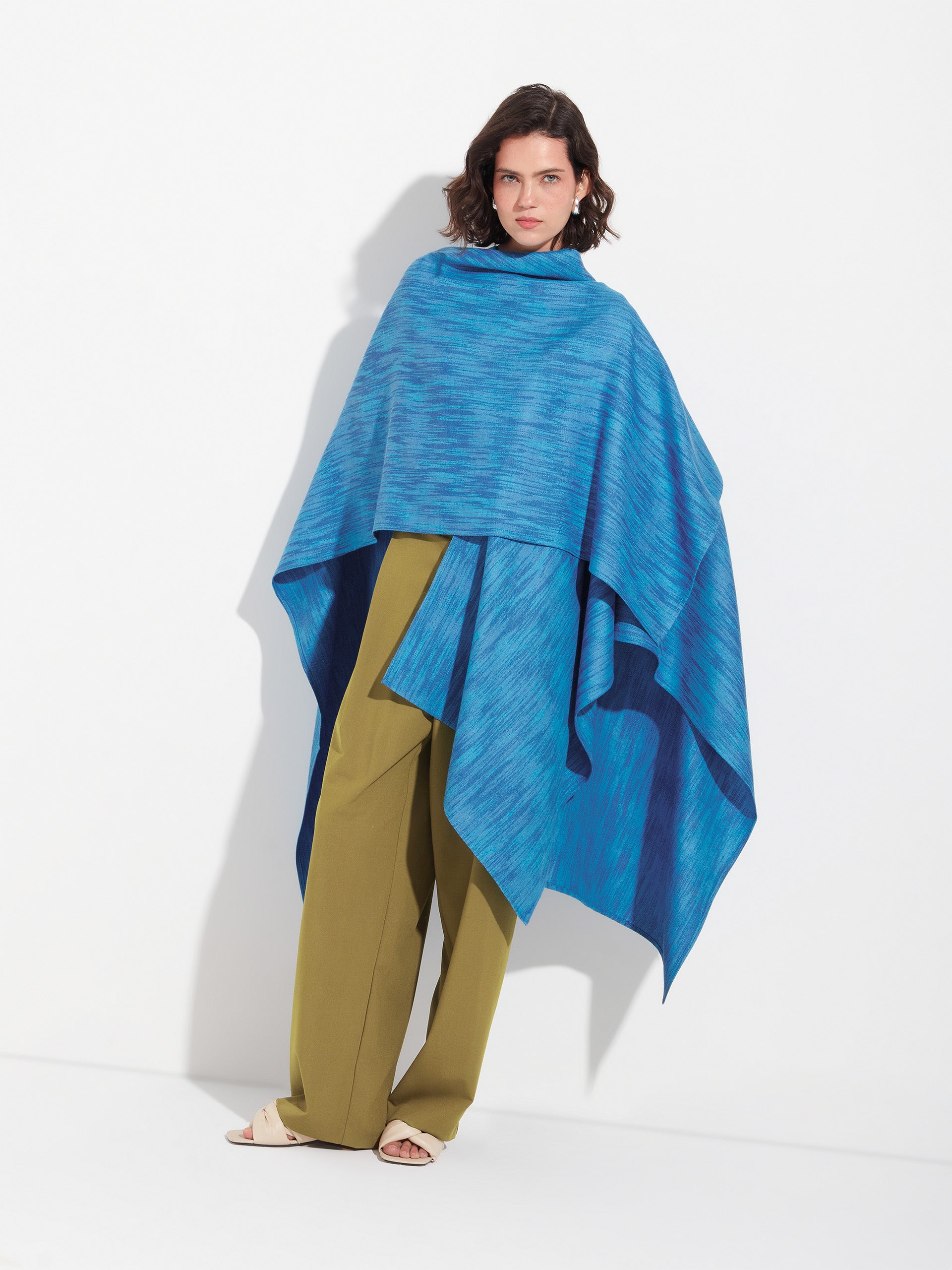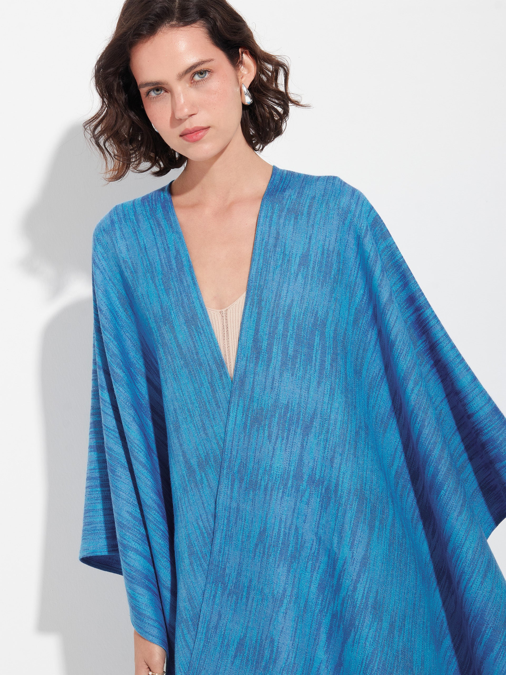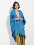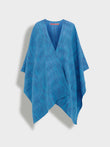 Purple Zareli cape, made from baby alpaca and silk. It is a double-sided cape with a three-color jacquard design, combining warmth, texture, and timeless elegance. | Predominant material: Baby Alpaca