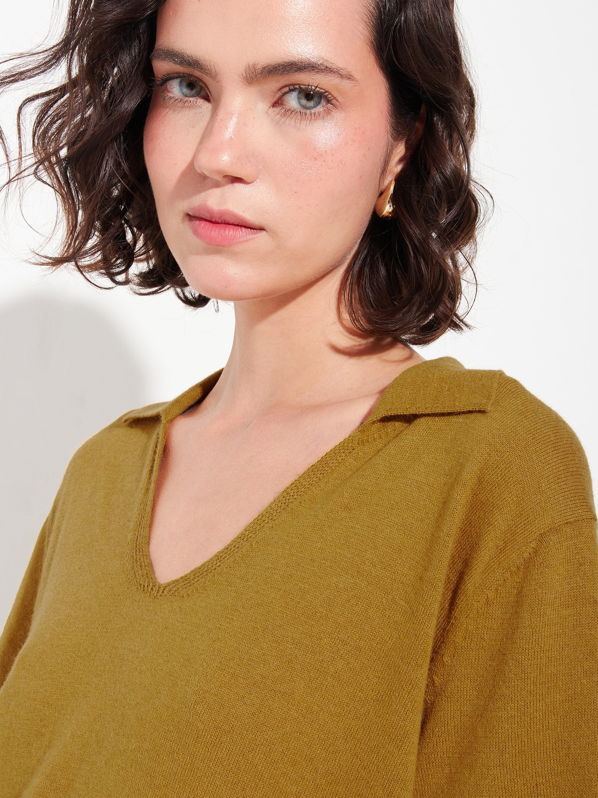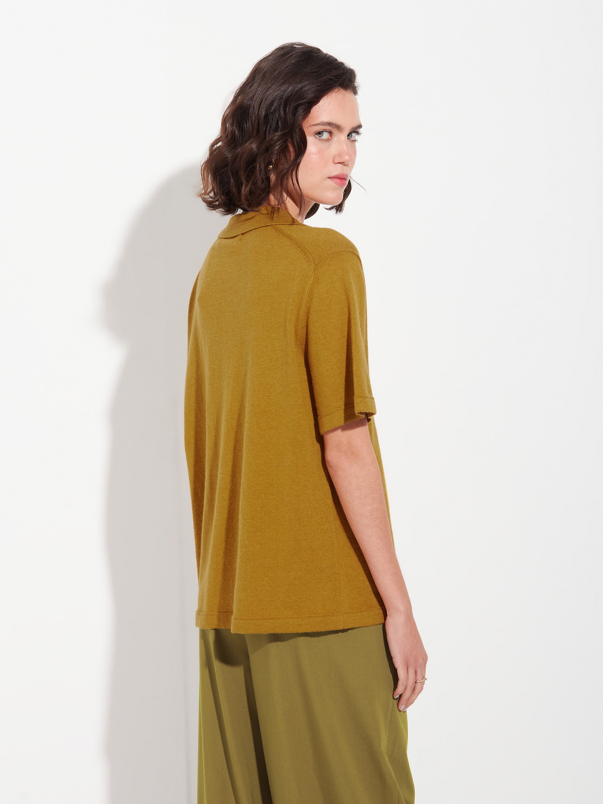 Yellow Zymba polo shirt, made from a blend of organic cotton and baby alpaca. This short-sleeved polo shirt is knitted in stockinette stitch for a soft, lightweight texture. Ideal for a casual look with a natural, sophisticated finish. | Predominant material: Cotton